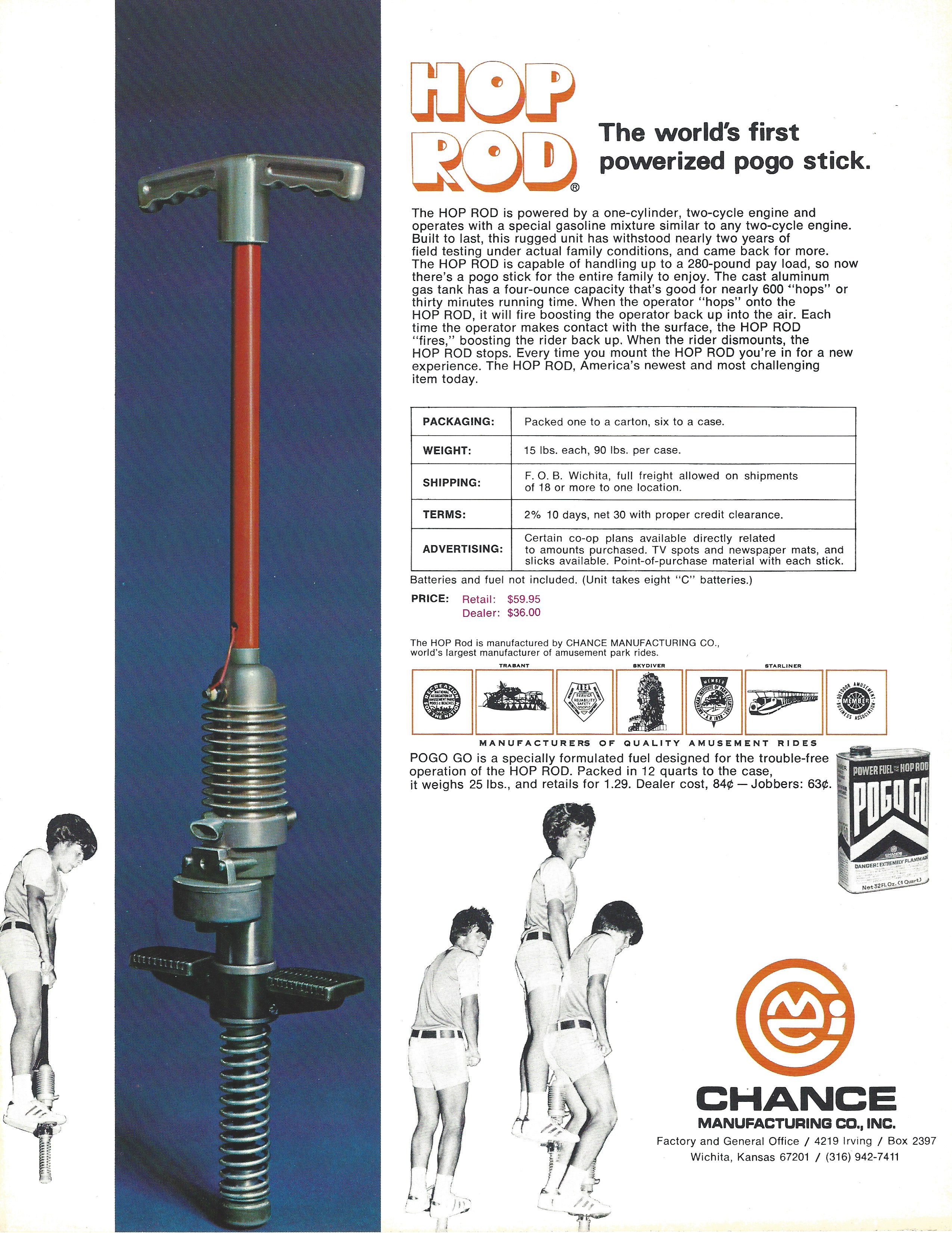 Manufactured in 1960 and 1961, powered pogo stick would toss an adult about 2 feet into the air with each hop (unless something went wrong).