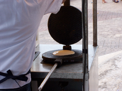 the Marquesita, he turns the Maker over. He can do this because there was a lot of heat built up in the lower (now the upper)