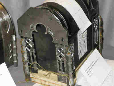 The big deal is that the whole center section decoration work is done. You can see the that the three center panels are completed and ready for riveting in place. As with the other decorative elements, they have a 14 gage upper layer and a layer of 18 ga steel in back.